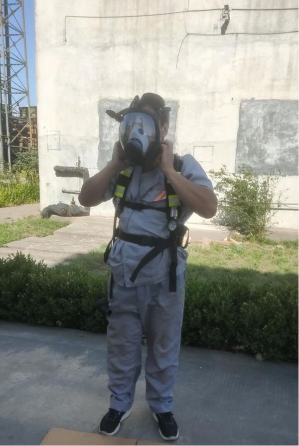 2、員工進行實操,在規(guī)定時間內(nèi)正確佩戴正壓式呼吸器。